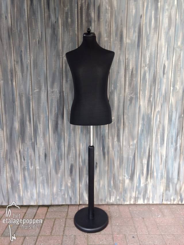 paspop buste torso man zwart maat 48 op ronde houten zwarte stander borstomvang 94 cm, taille 82 cm, heupomvang 97 cm
